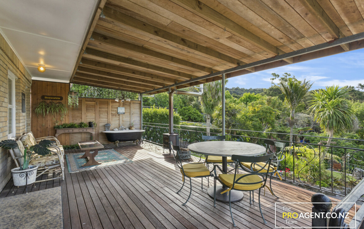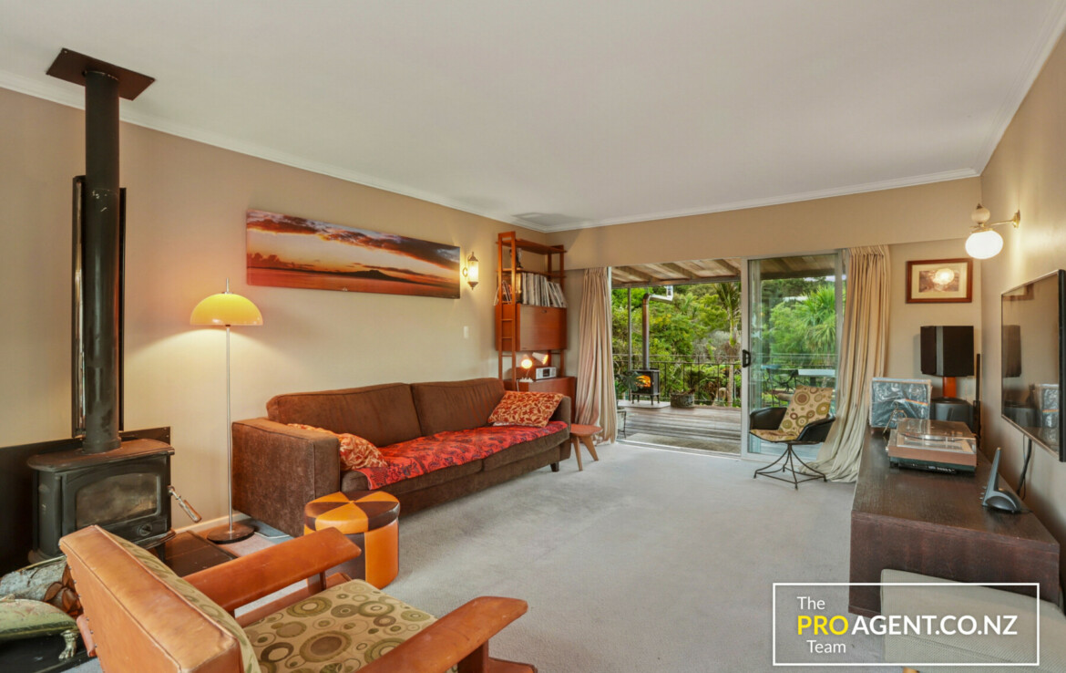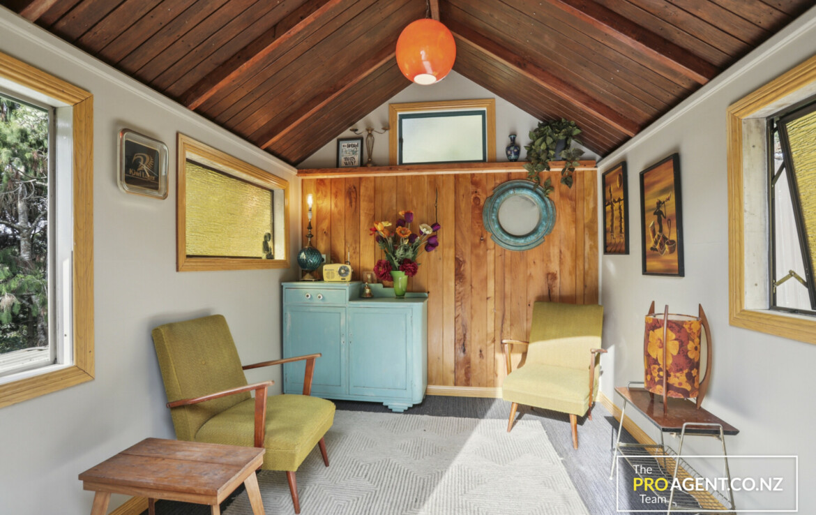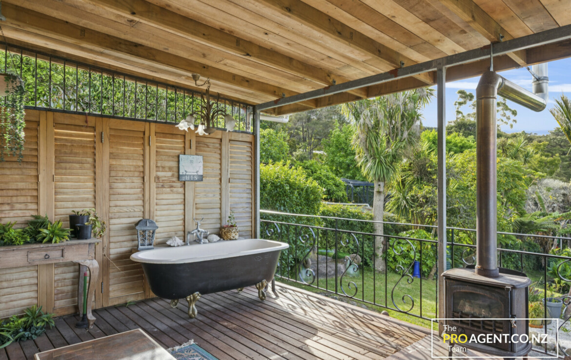 Inside, the character shows through simple, honest materials. The dining area has polished timber floors, the kitchen features a solid rimu benchtop, and the living room opens out in two directions, bringing in morning light and glimpses of the harbour to the east, and connecting to a sheltered, fully covered deck and peaceful garden to the west. The flow between indoors and outdoors is effortless, making the home ideal for entertaining or quiet family time by the fire.