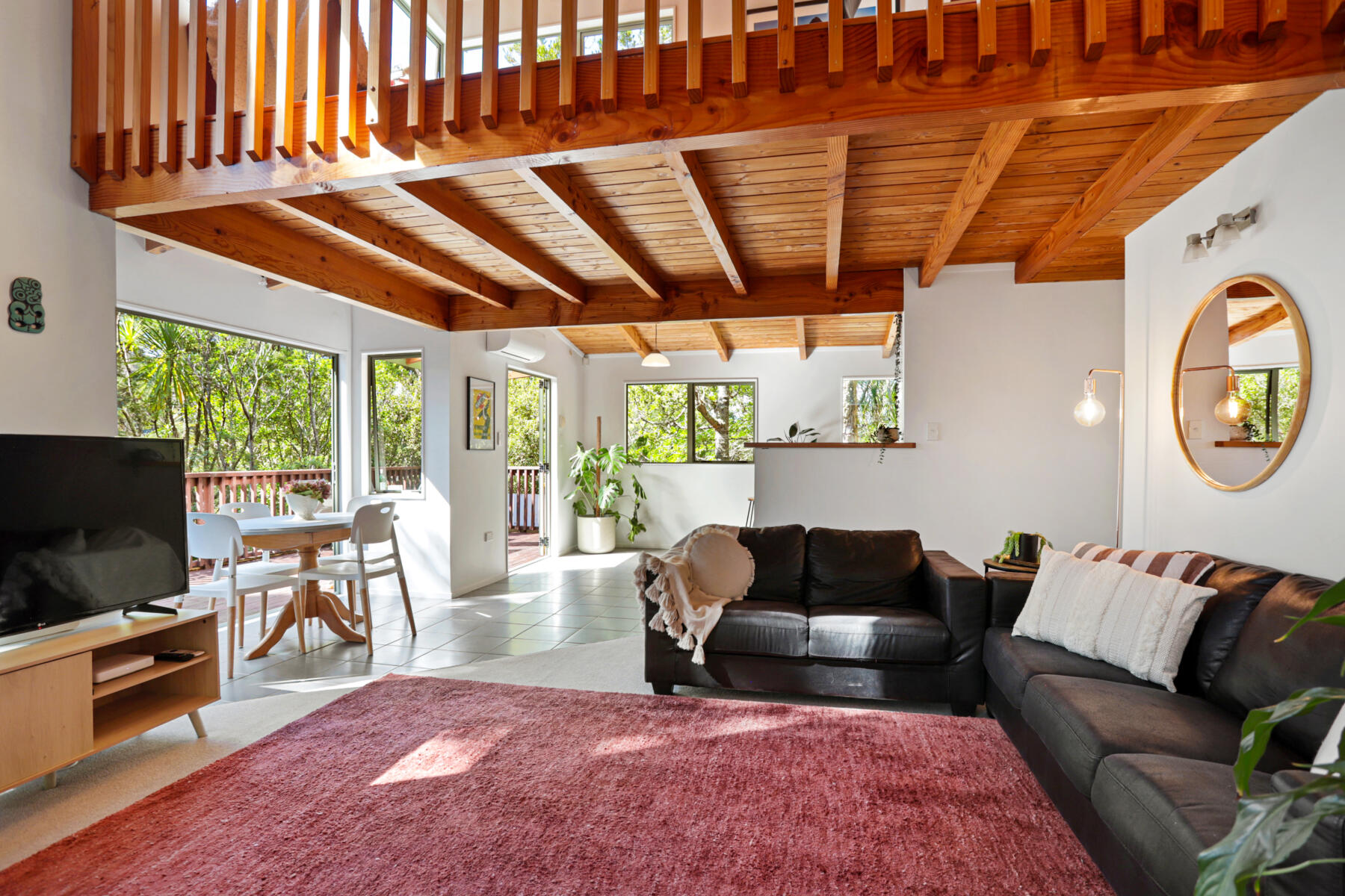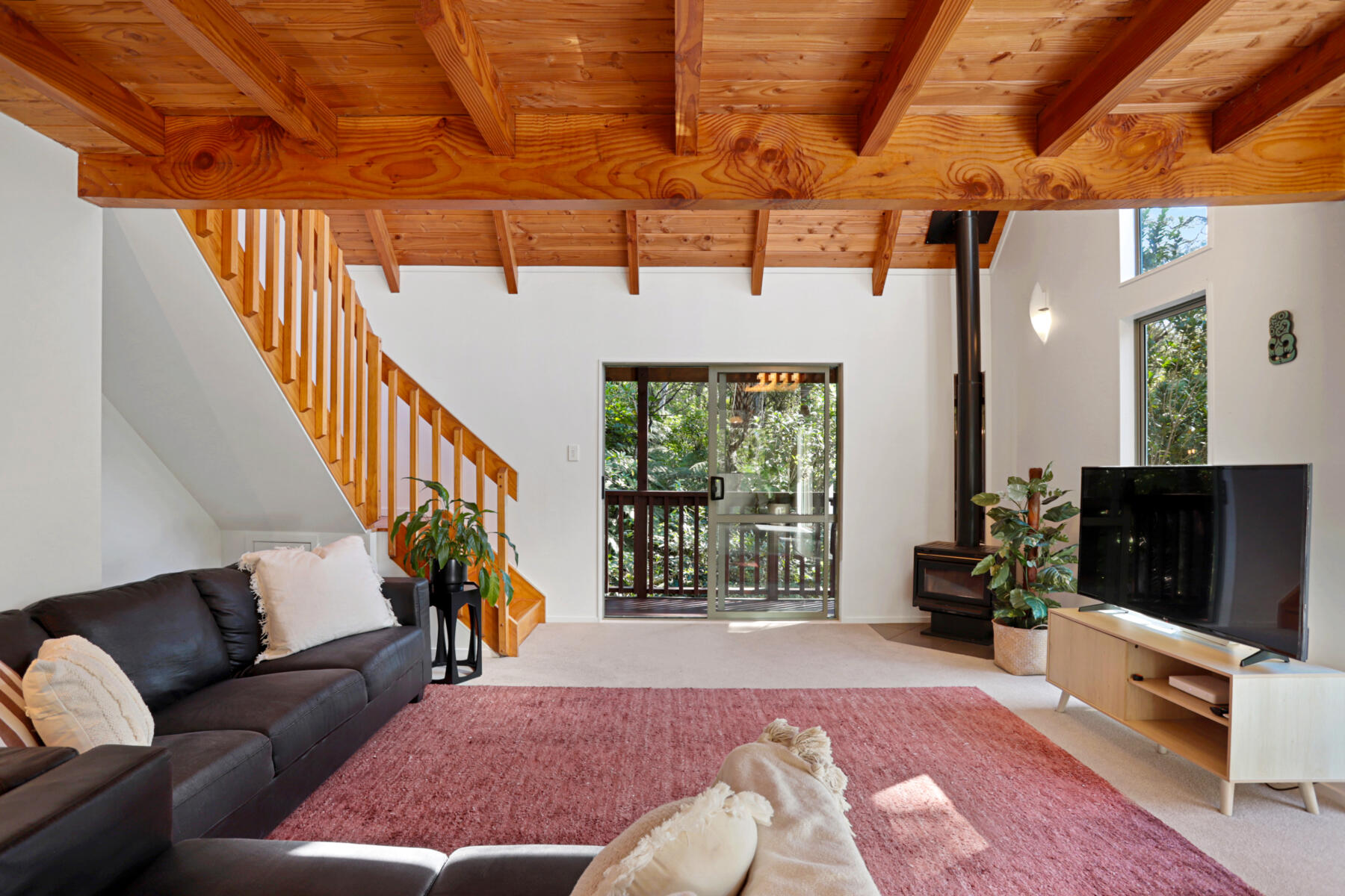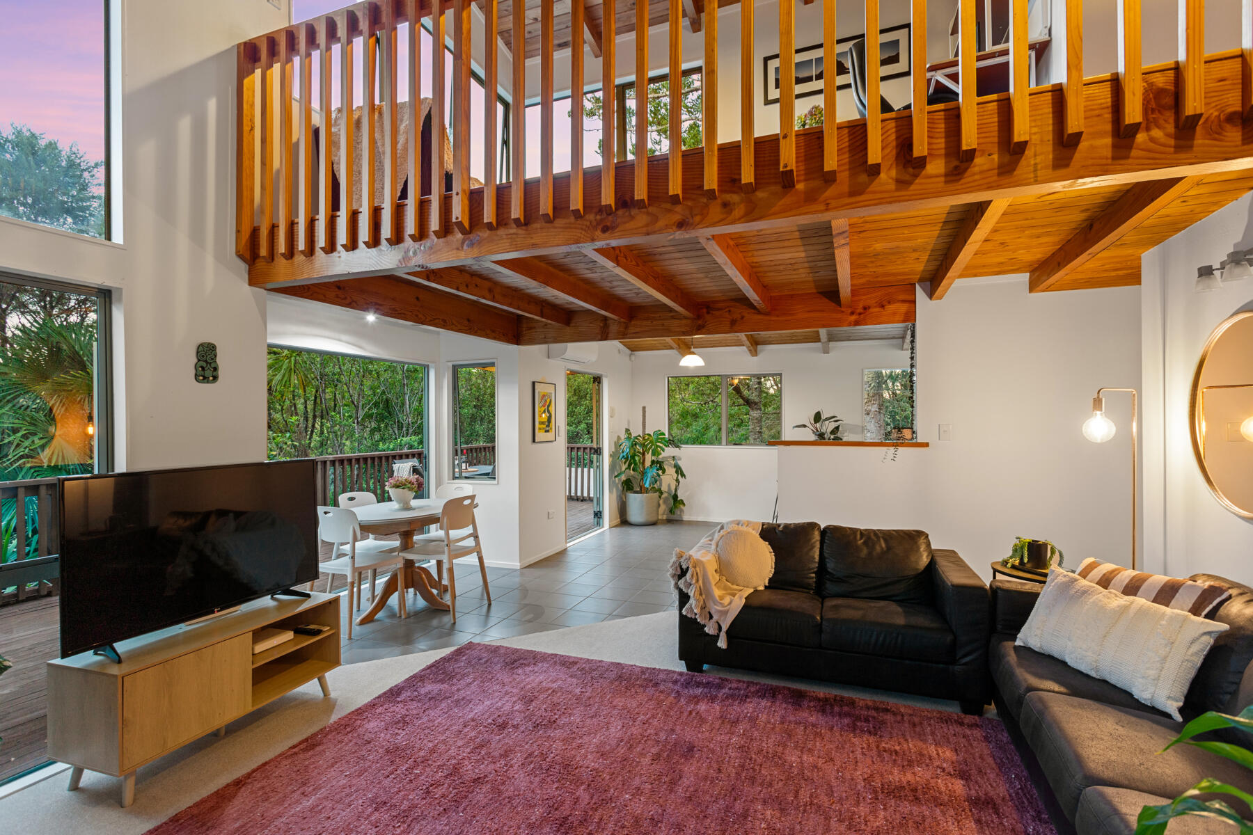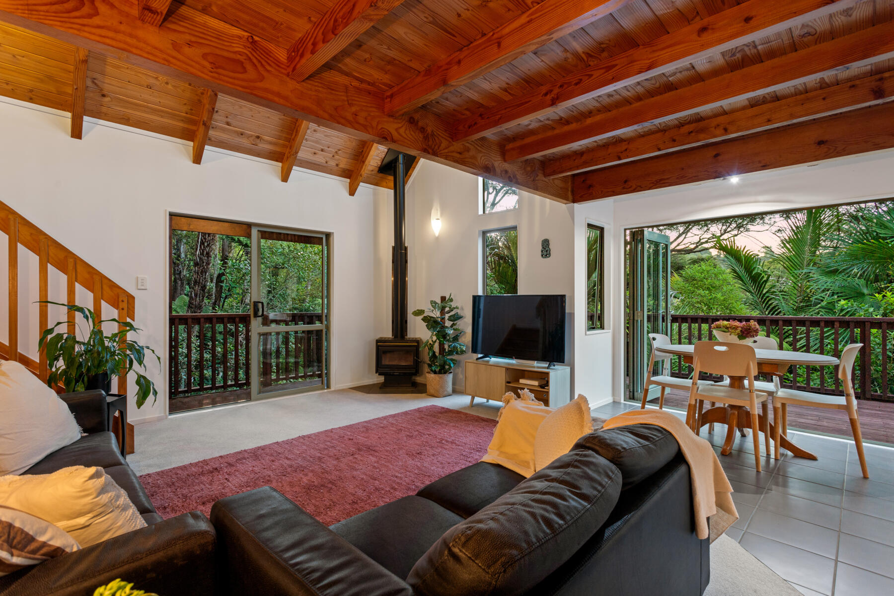 The main living area is bright, warm and welcoming, with large windows drawing in natural light and opening seamlessly to a sun-soaked deck. Bathed in sunshine, this is a space where you can relax, entertain or simply enjoy the peaceful outlook over the surrounding greenery.