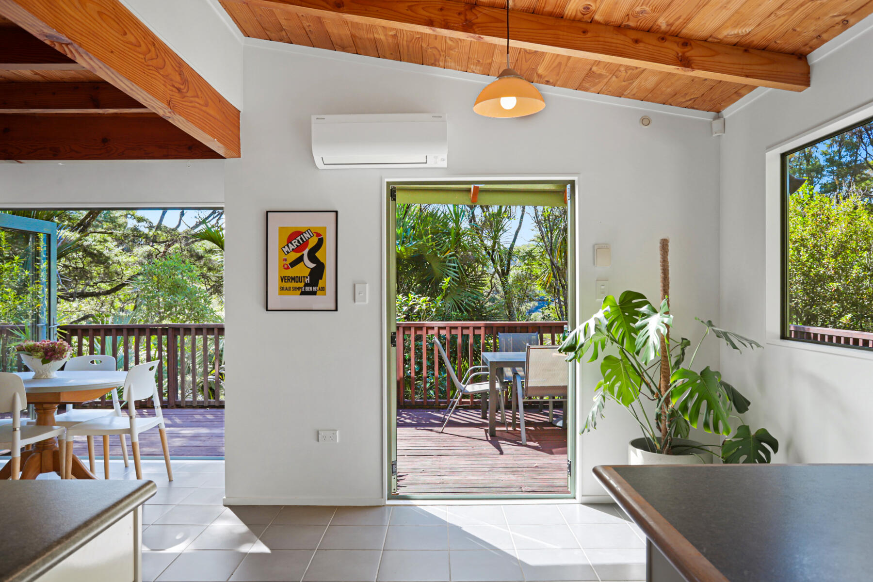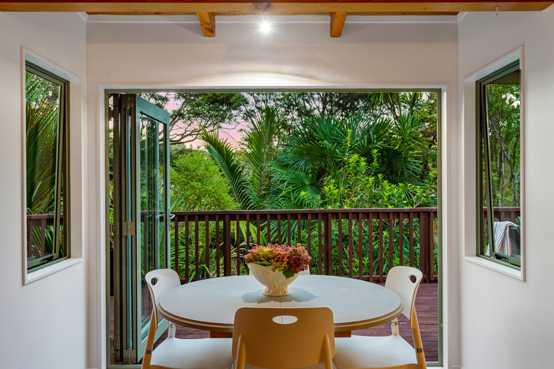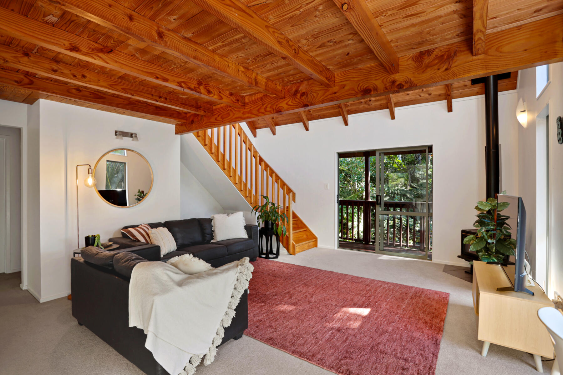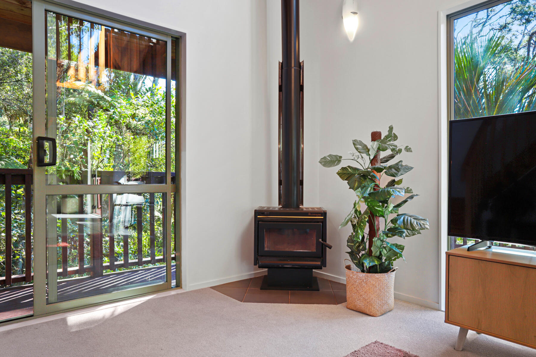 The main living area is bright, warm and welcoming, with large windows drawing in natural light and opening seamlessly to a sun-soaked deck. Bathed in sunshine, this is a space where you can relax, entertain or simply enjoy the peaceful outlook over the surrounding greenery.