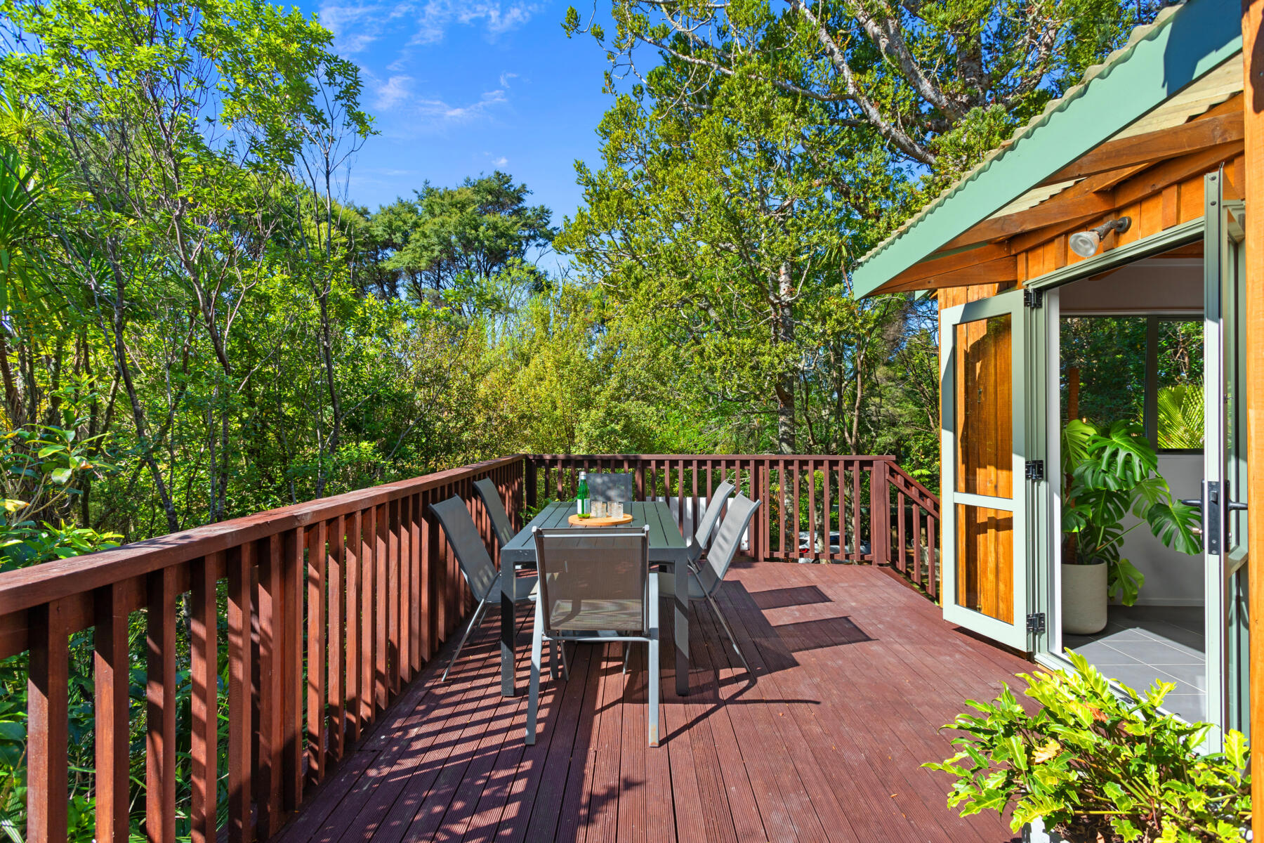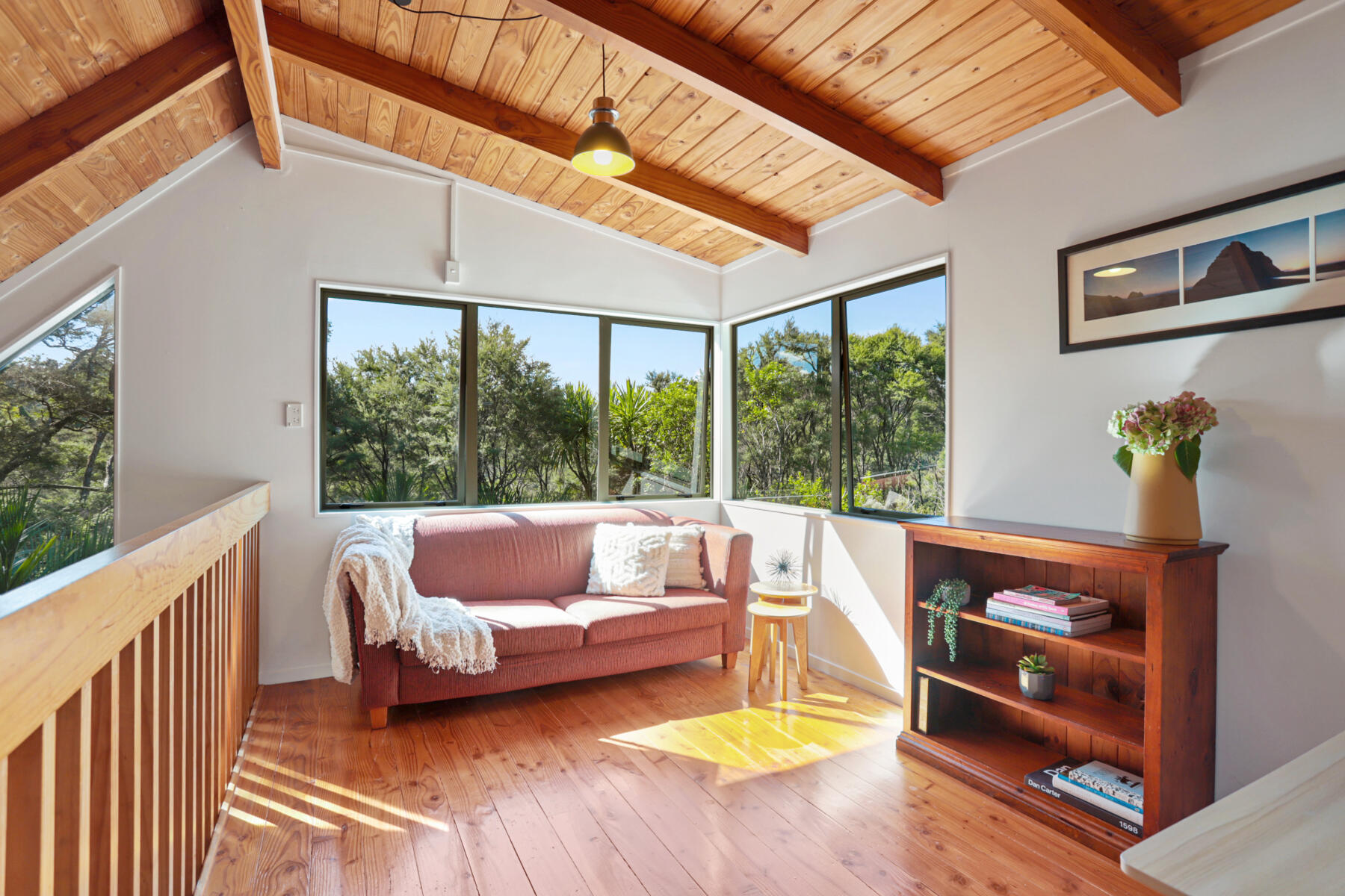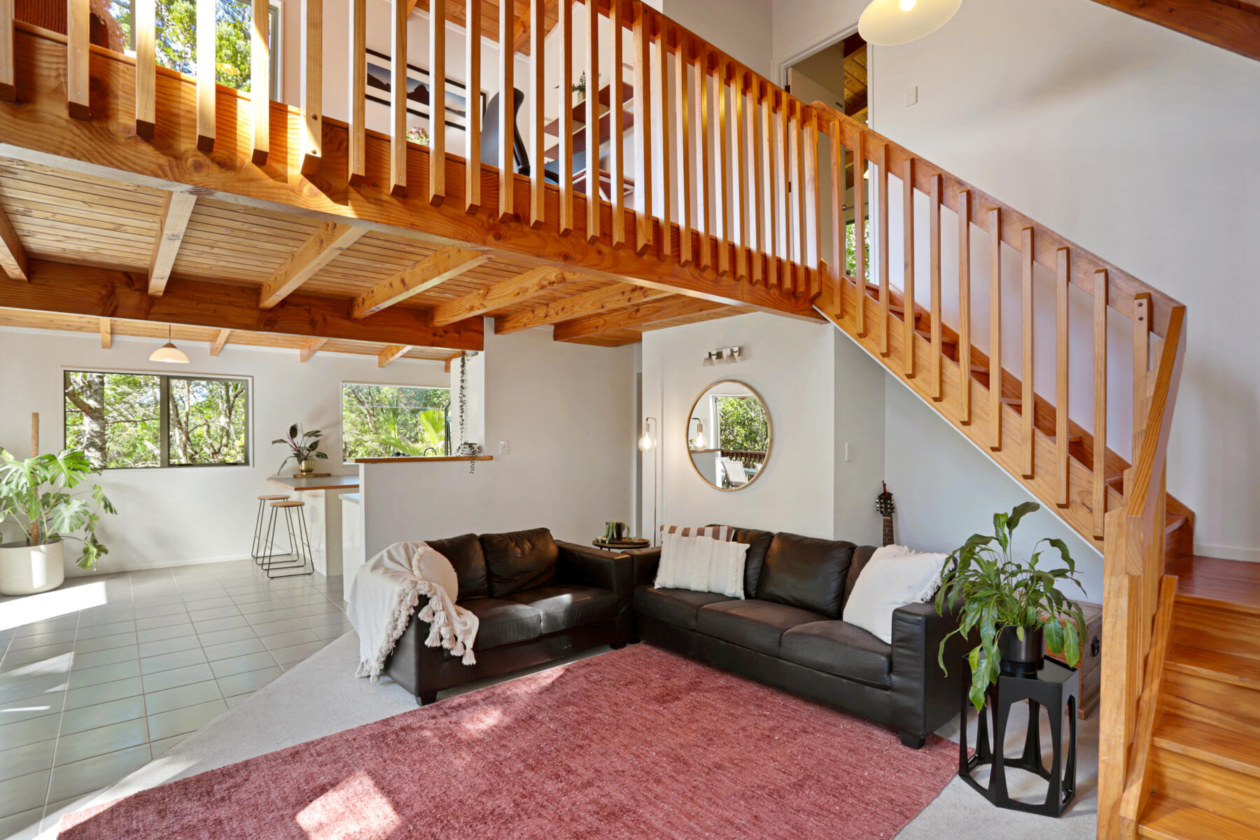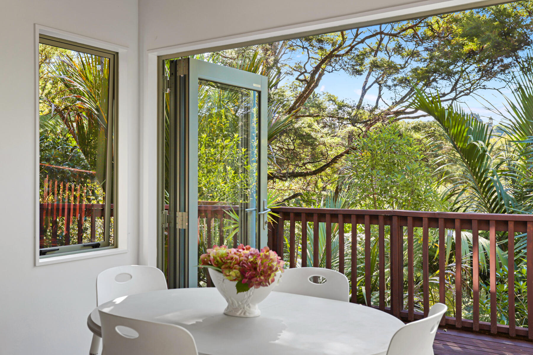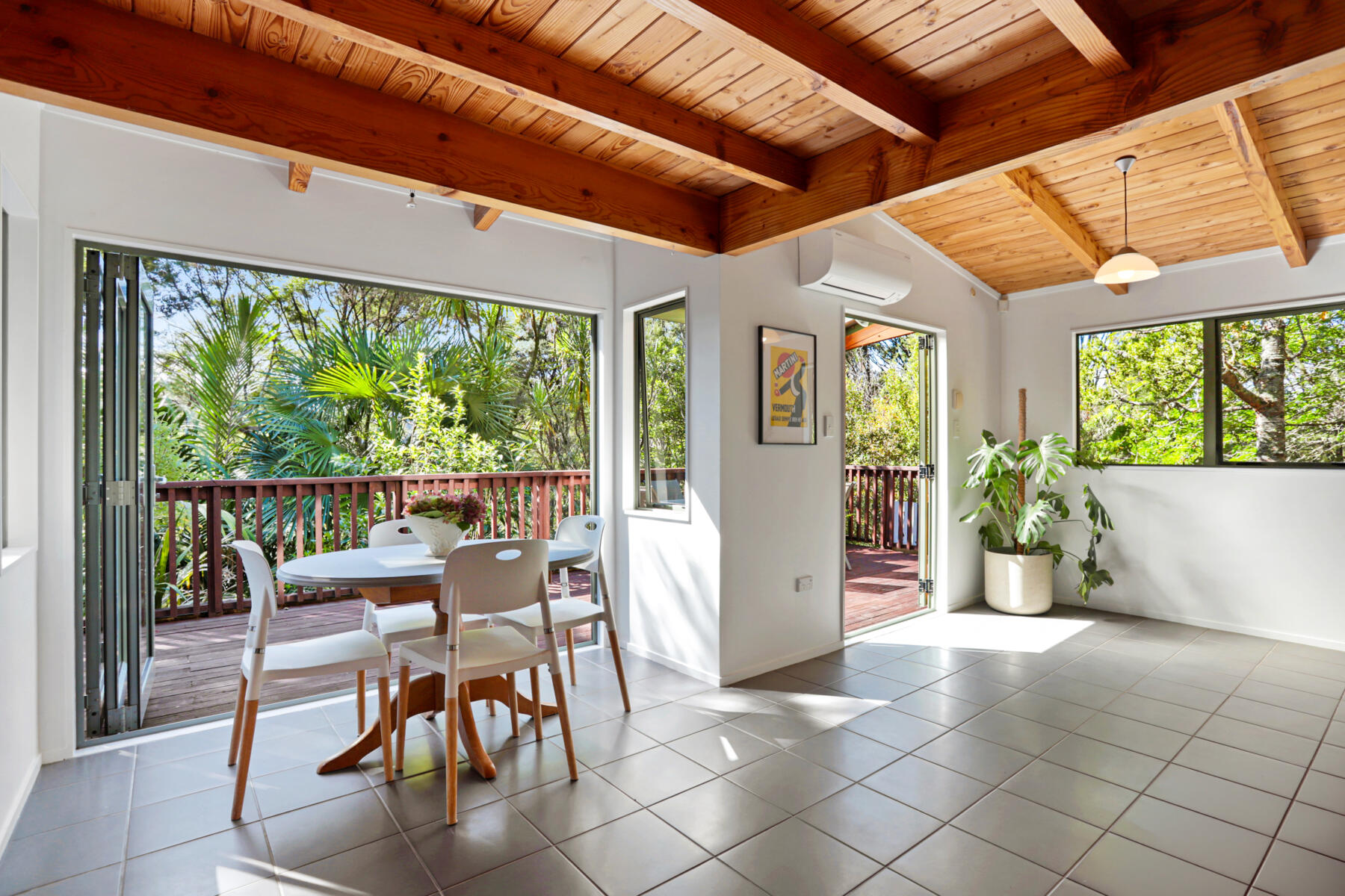 The main living area is bright, warm and welcoming, with large windows drawing in natural light and opening seamlessly to a sun-soaked deck. Bathed in sunshine, this is a space where you can relax, entertain or simply enjoy the peaceful outlook over the surrounding greenery.