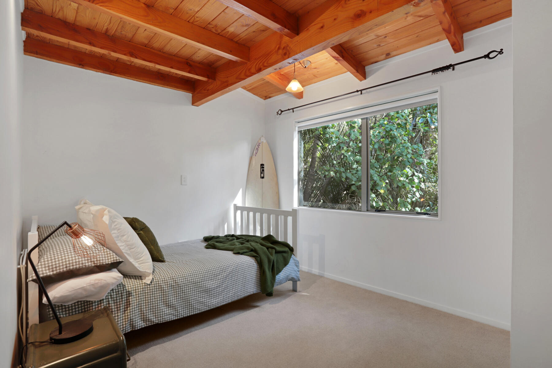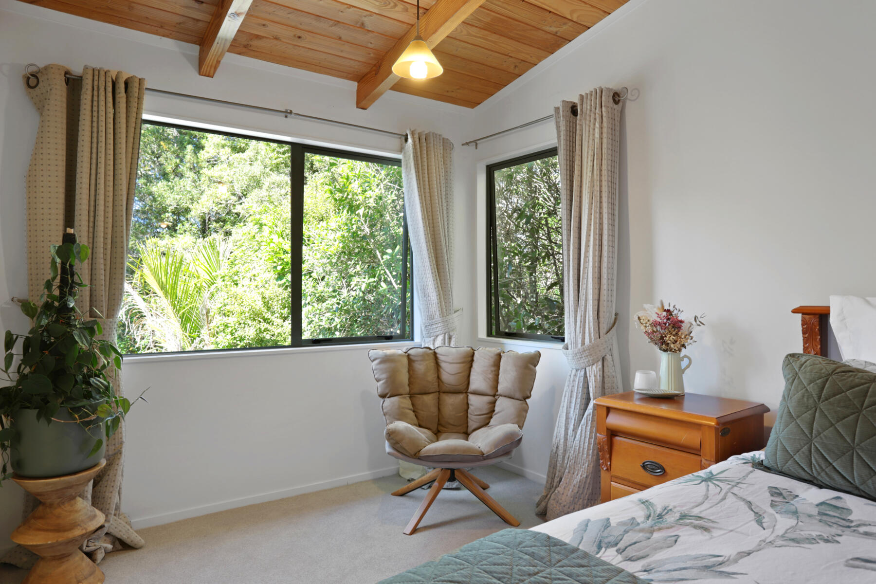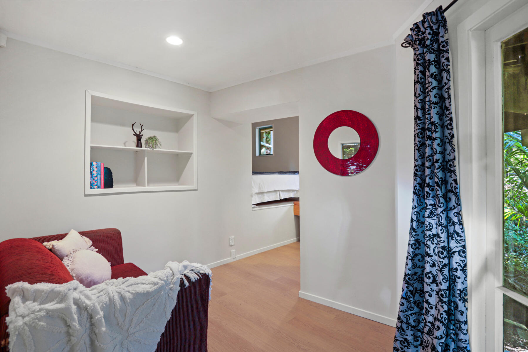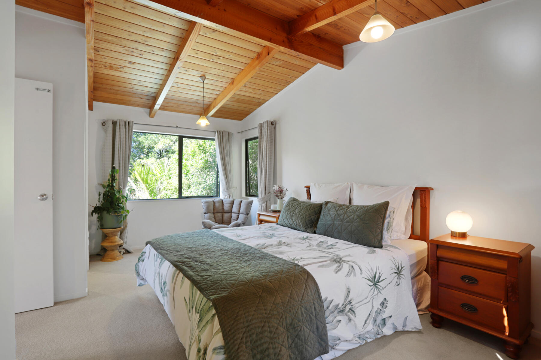 The main living area is bright, warm and welcoming, with large windows drawing in natural light and opening seamlessly to a sun-soaked deck. Bathed in sunshine, this is a space where you can relax, entertain or simply enjoy the peaceful outlook over the surrounding greenery.