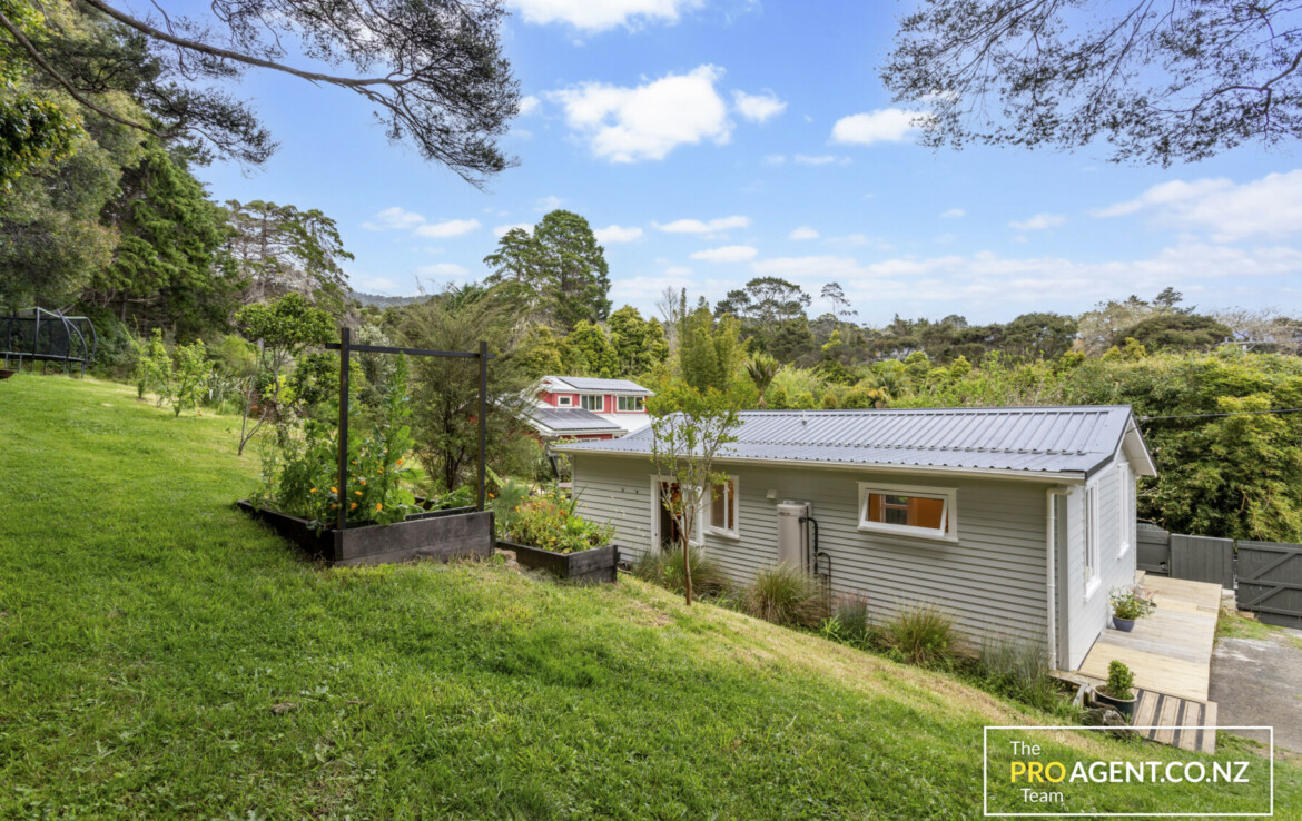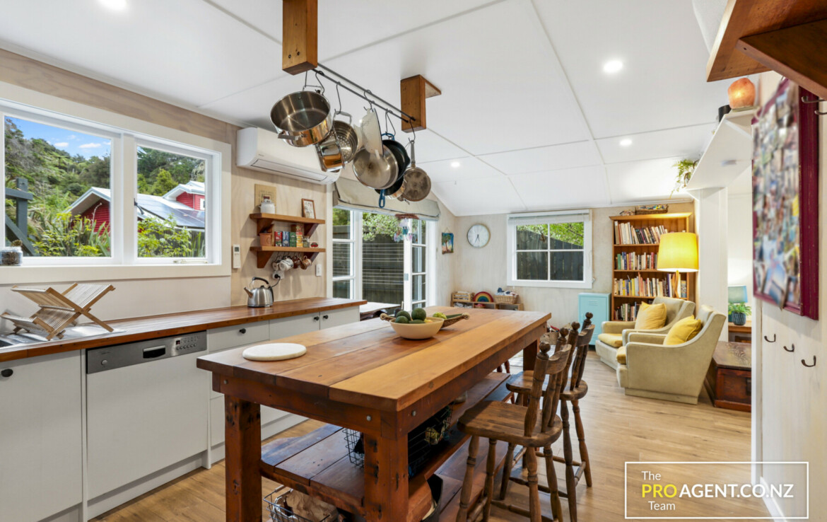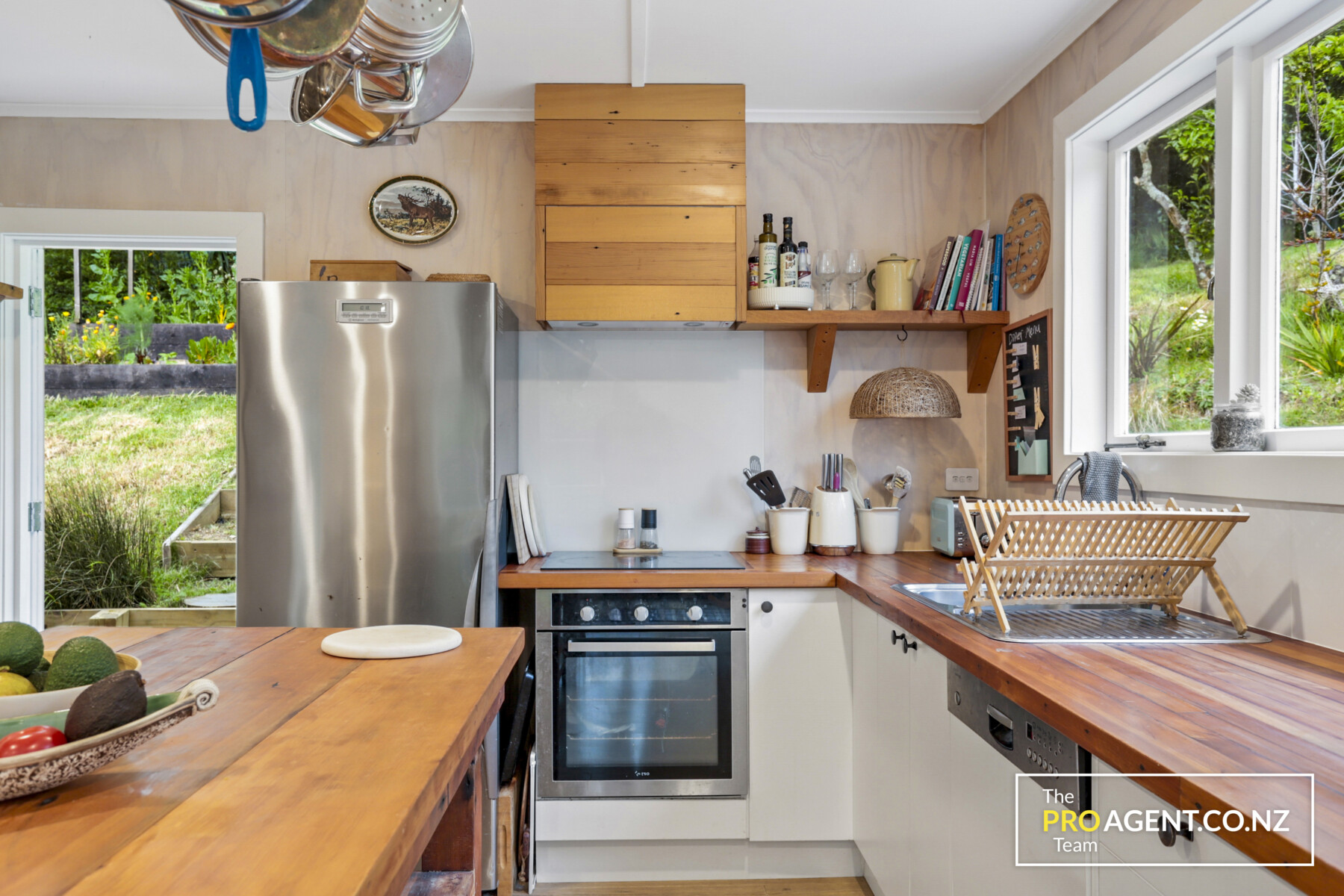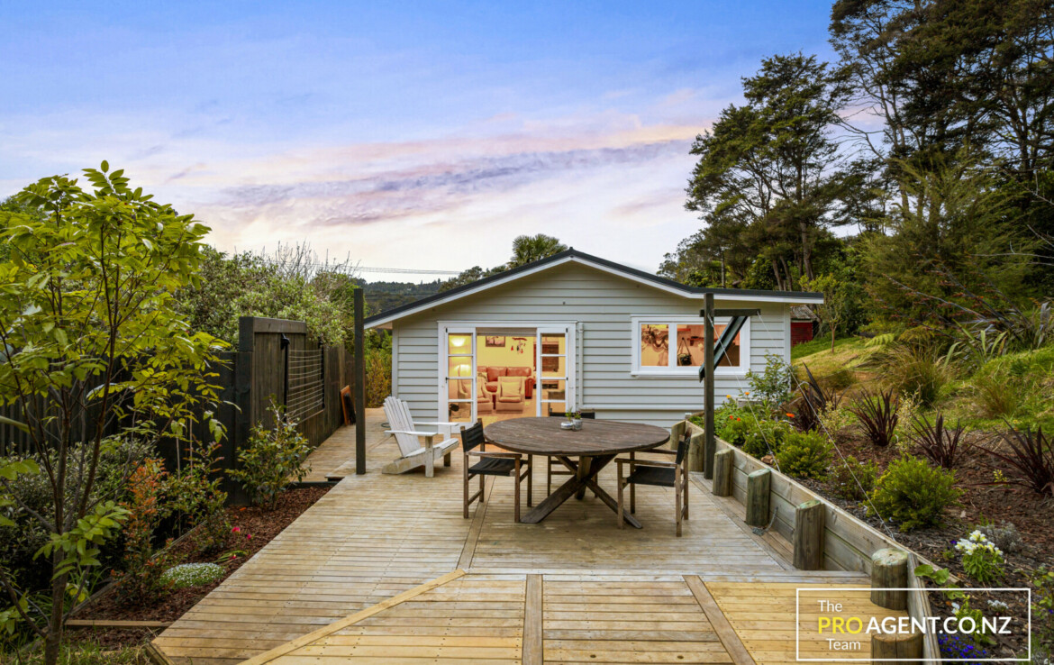 This beautifully renovated weatherboard home captures everything there is to love about coastal living in Parau. Full of warmth, character and charm, it’s the perfect retreat for those who value lifestyle, connection and a touch of everyday magic. Clean, eco living and sustainability have been thoughtfully considered, with wool carpet in both bedrooms, natural paints by The Natural Paint Co. used throughout, and repurposed kauri benchtops adding timeless character. The owners have also been deeply conscious of the environment outdoors, intentionally planting over 50 native trees and shrubs to attract birdlife and pollinators, creating a flourishing, biodiverse garden sanctuary.