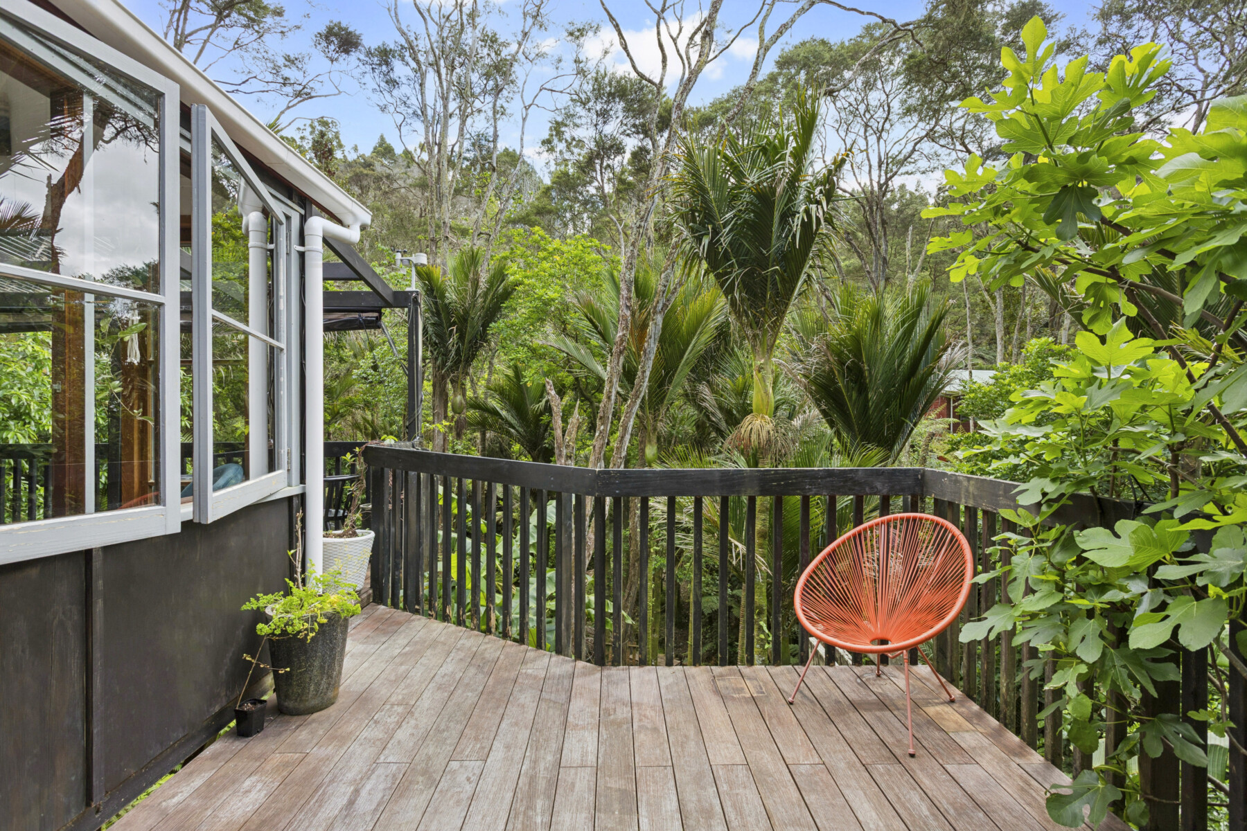 The garden is a defining feature of the property. Layered and full of character, it offers a sense of adventure and immersion that is increasingly hard to find. Multiple decks and a pergola provide places to pause, while paths wind beneath lush nikau palms. Glow worms are visible after dark, and changing birdlife marks the seasons in this native forest garden.